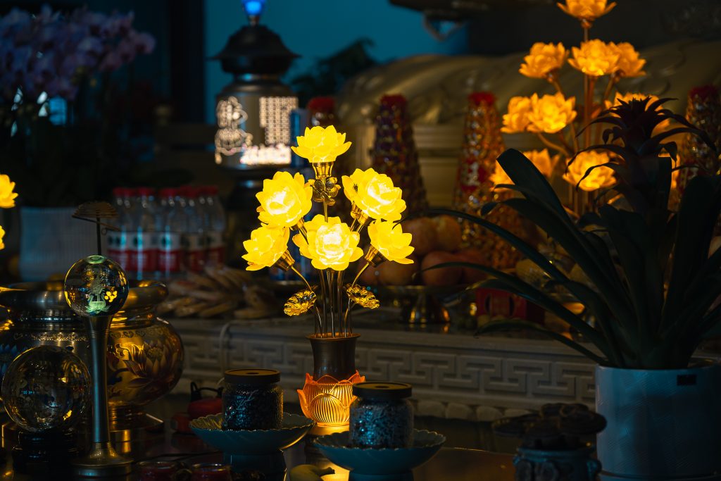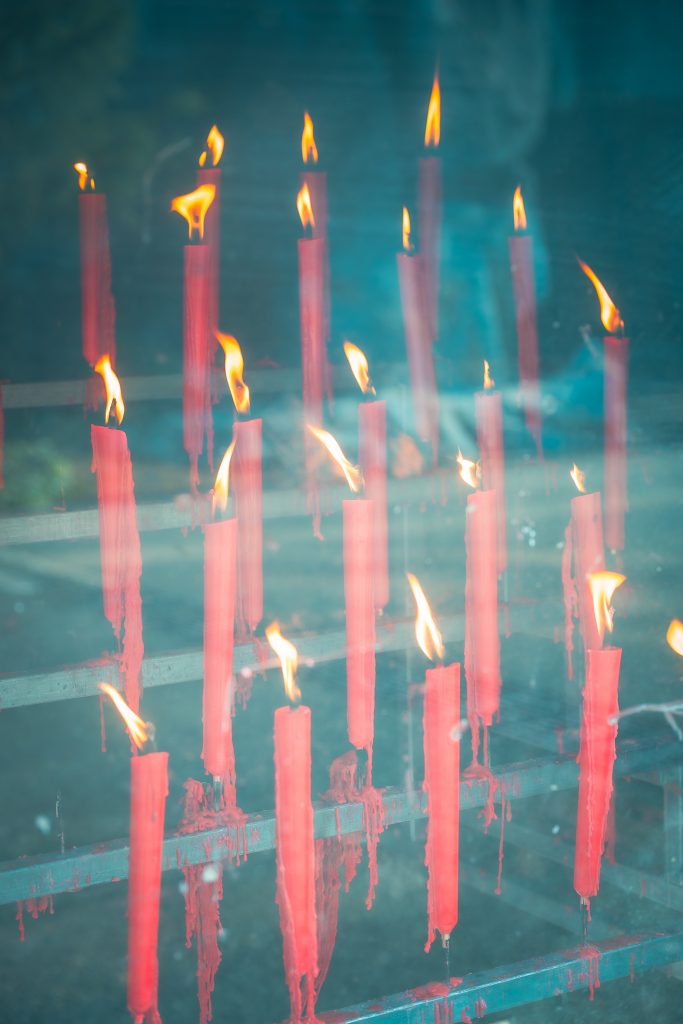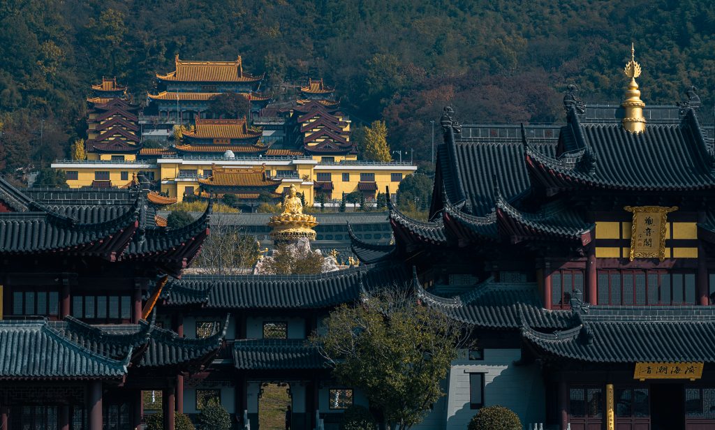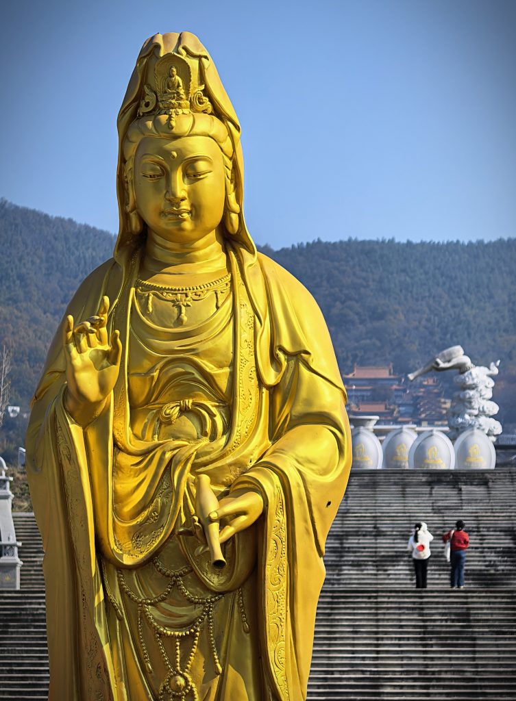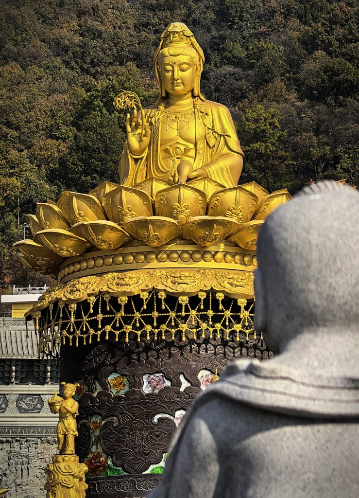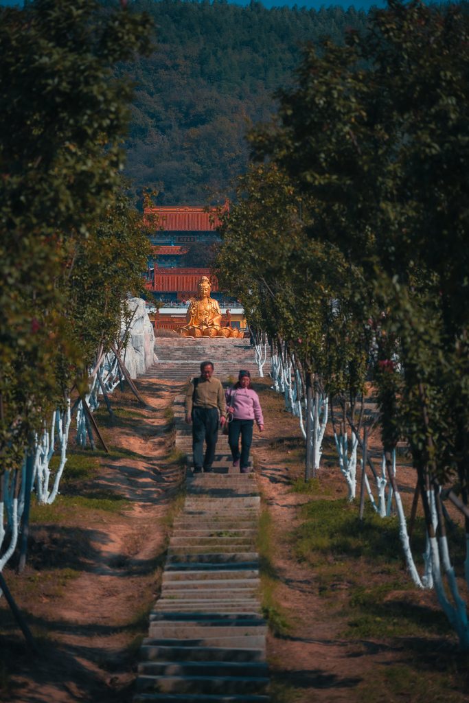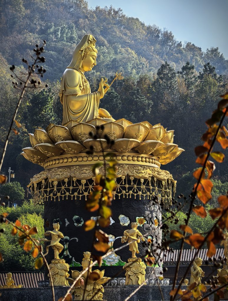 A Donglu-hegy lábától csodálatos kilátás nyílt a teljes templomegyüttesre, ahogy a sárga és arany épületek magasan felkúsztak az őszi színekben pompázó hegyoldalra. Szintről szintre, mondhatni stációról stációra haladtunk egyre felfelé fizikálisan és szellemileg is. Mintha az ég felé tartottunk volna. Utunkat a mindent halló és látó Guanyin, az irgalom istennőjének oltalmazó tekintete kísérte.