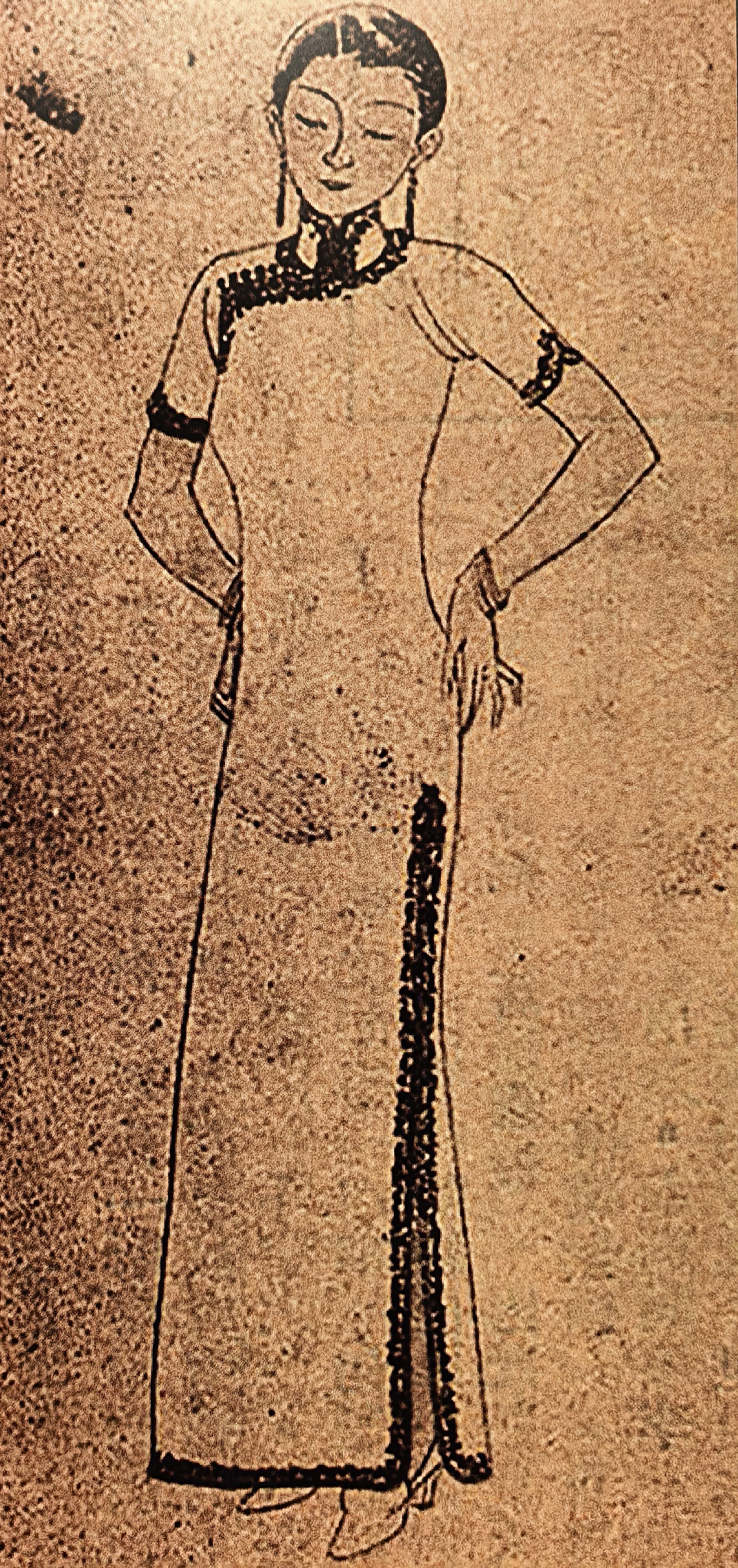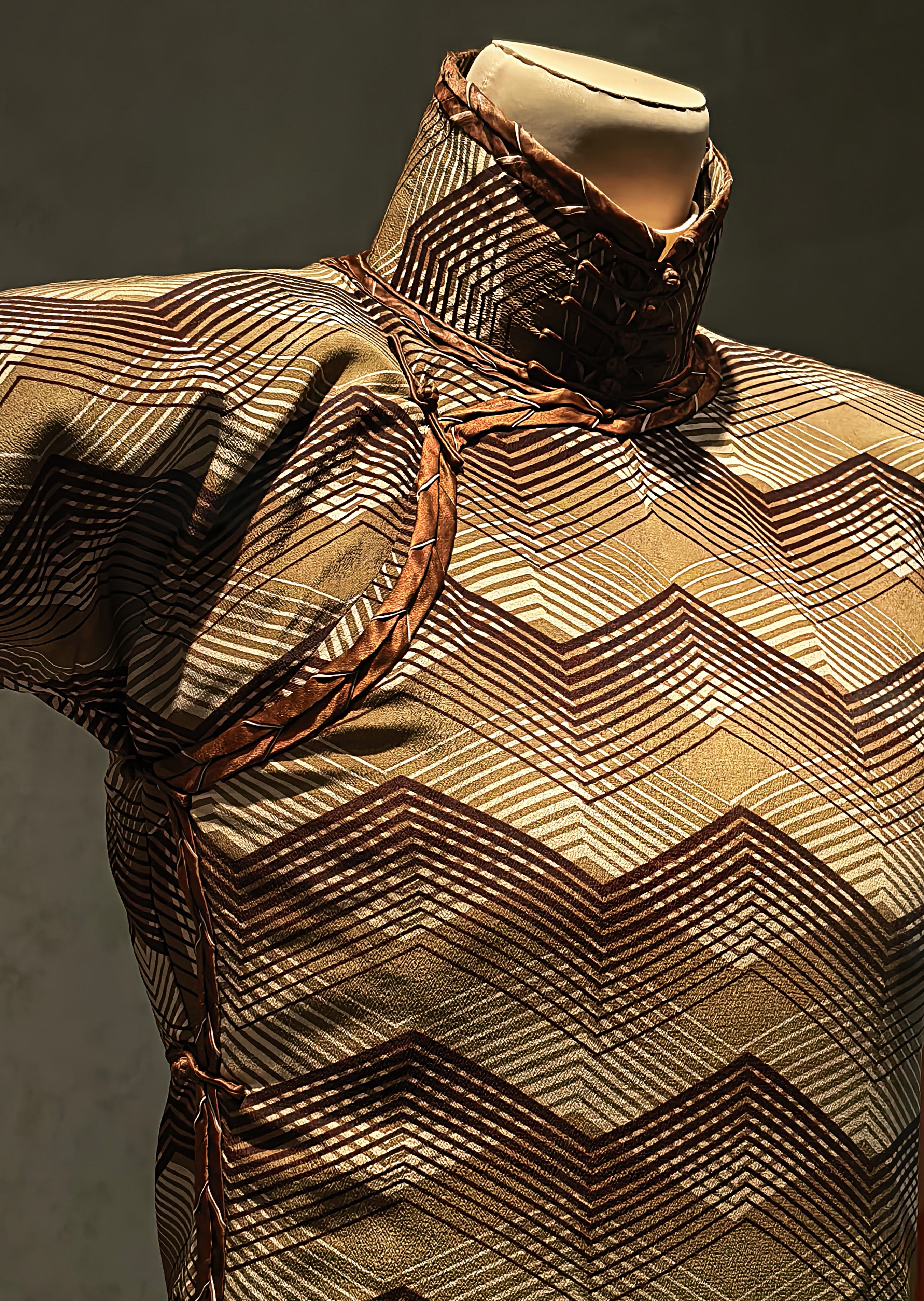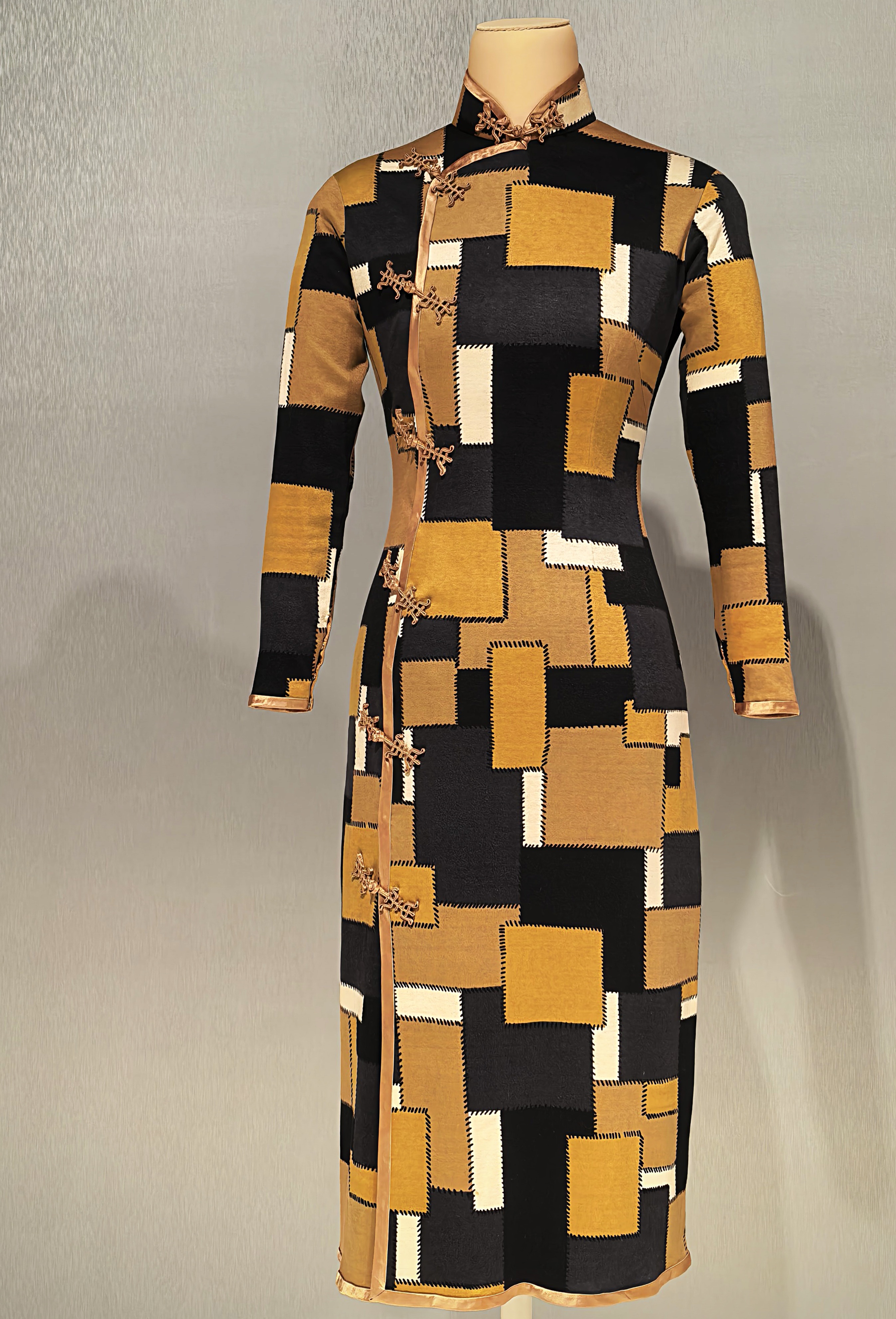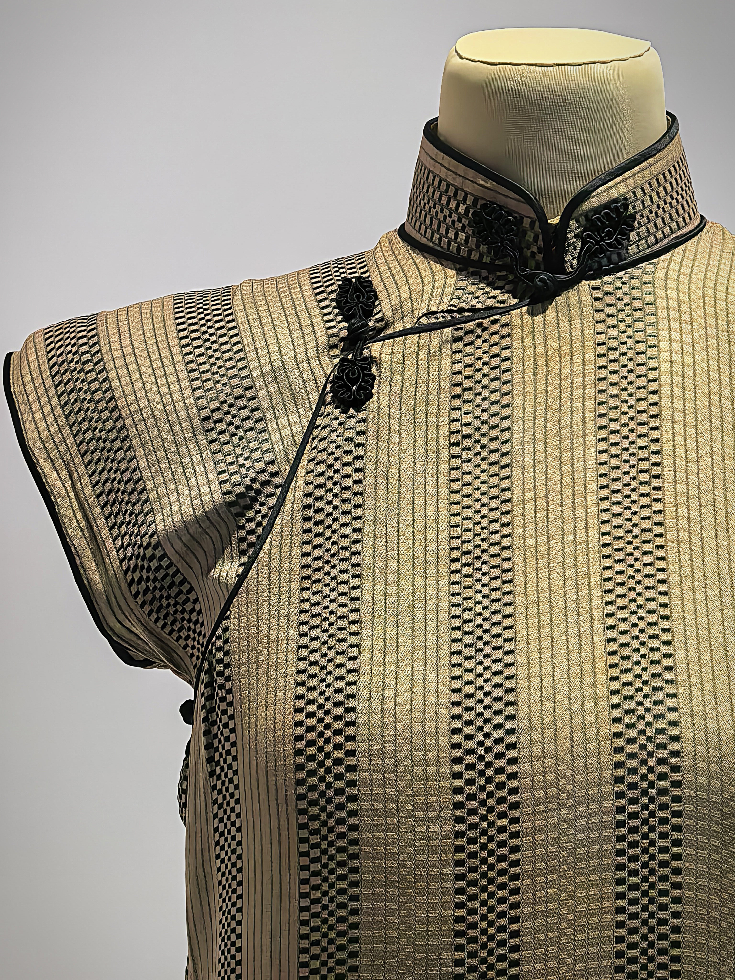 Az 1930-as évek kedvelt krepp selyemszövet qipaoja bronz színben cikk cakk mintával.
