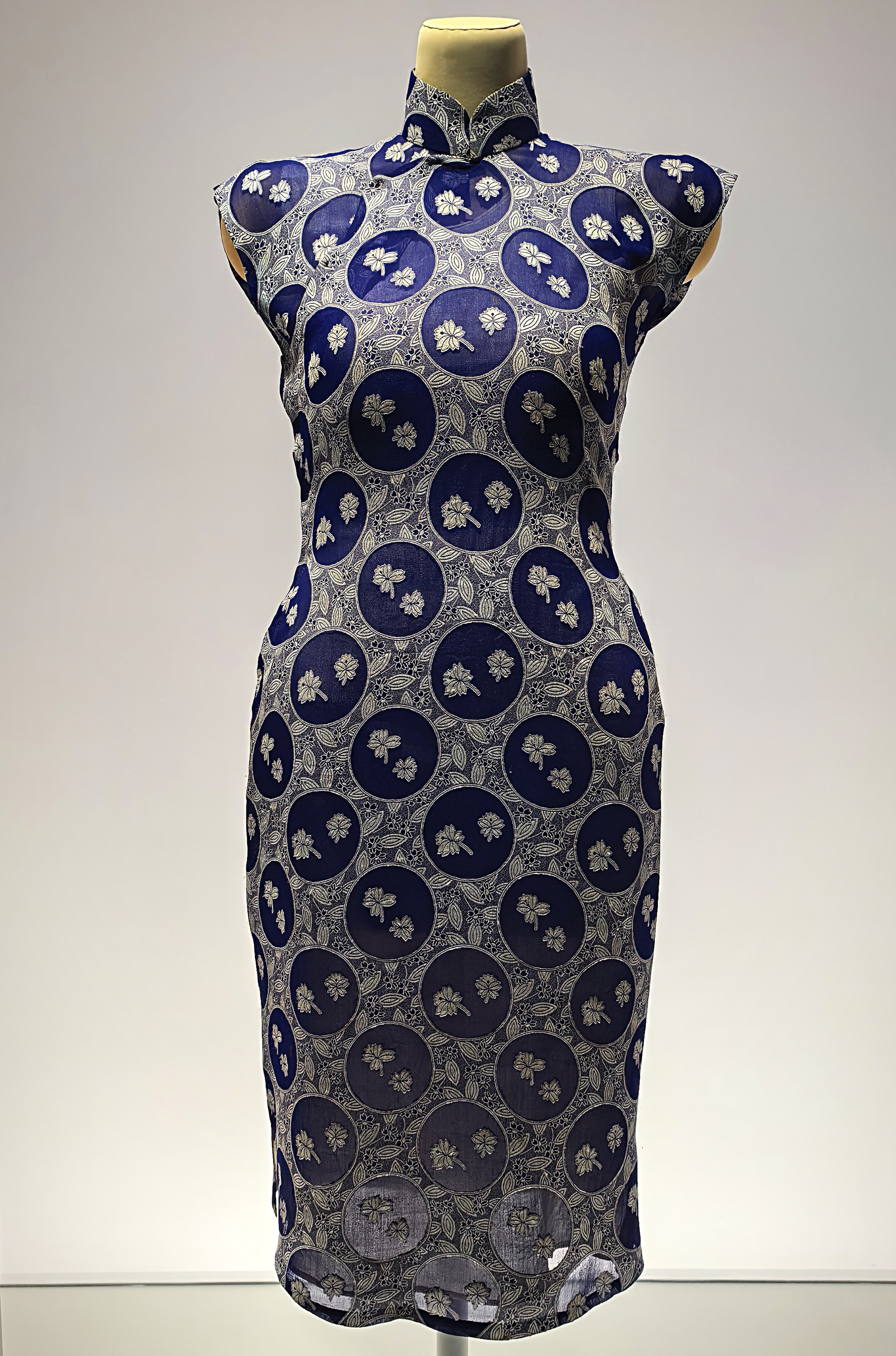 Kék jacquard georgette qipao az 1940-es évekből.