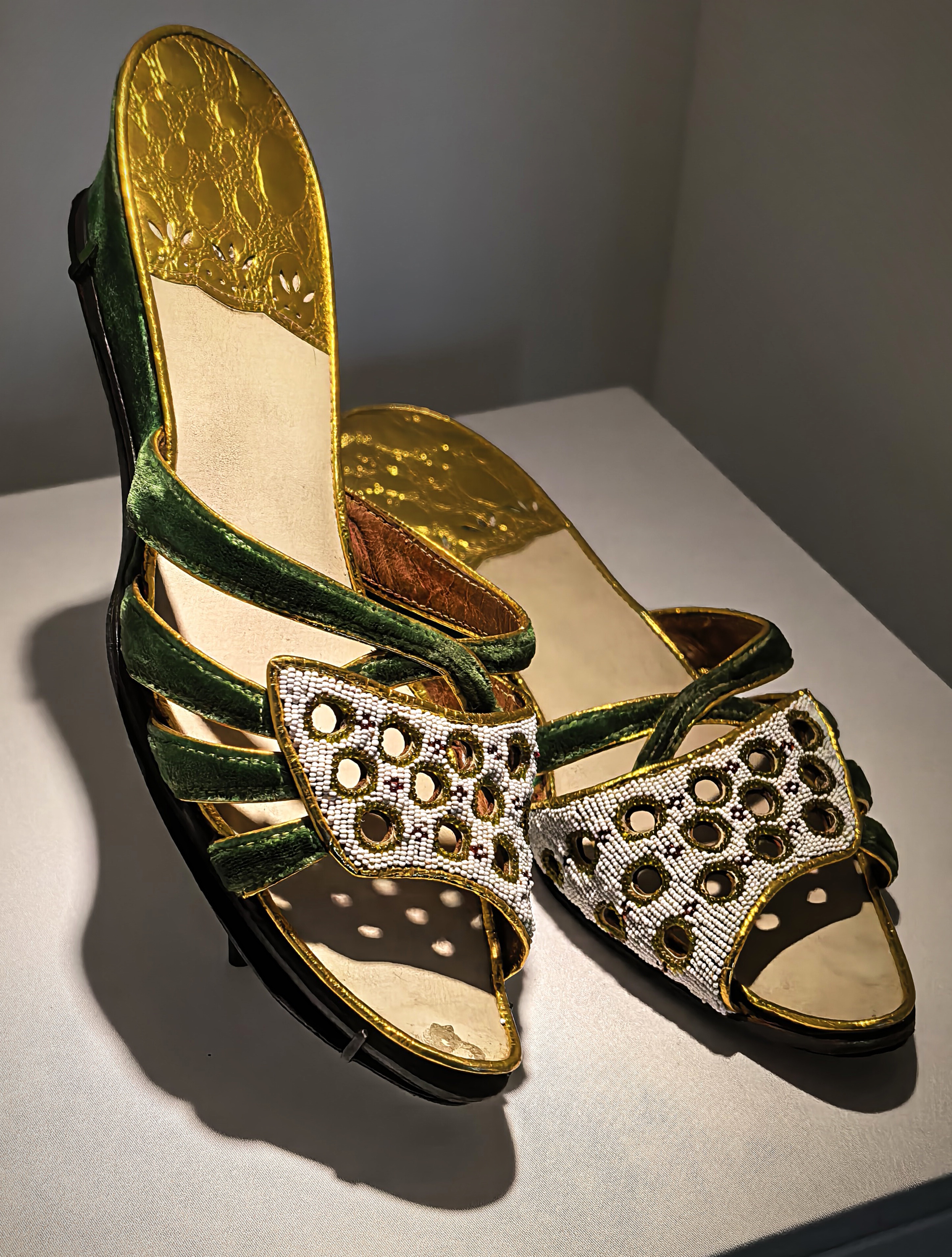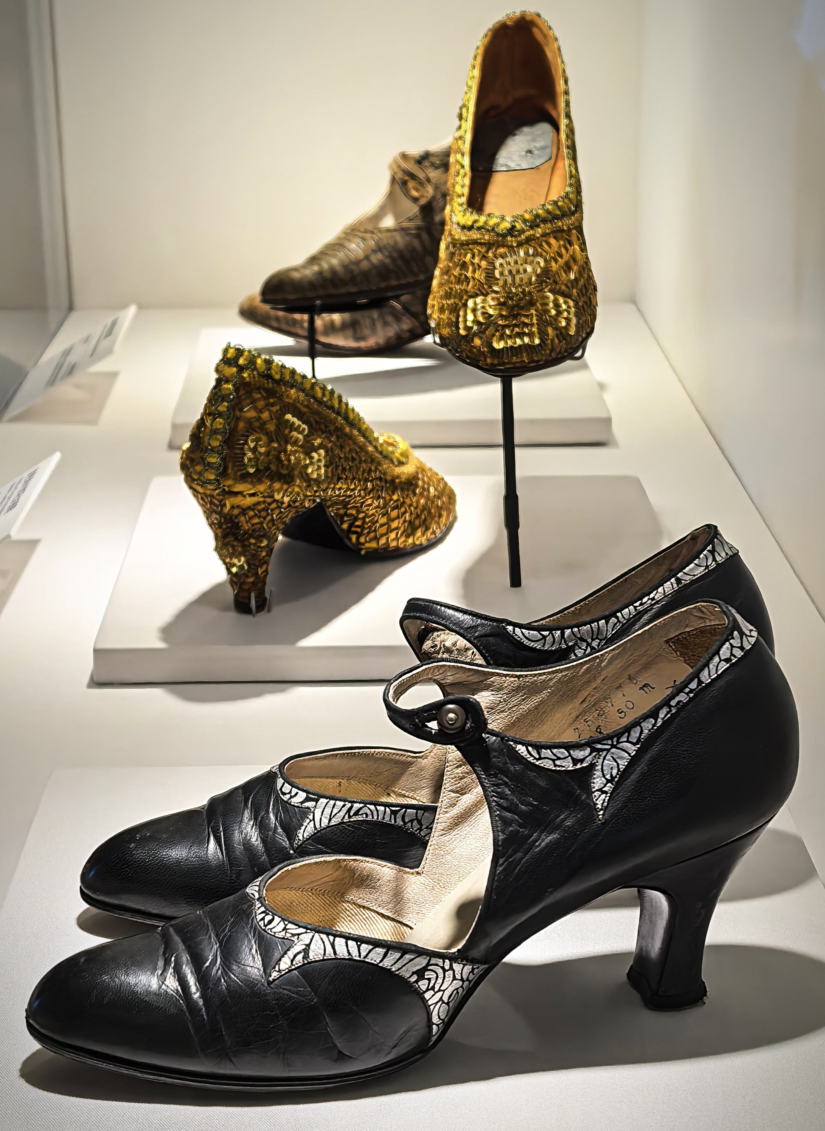 Arany cipő és fekete bőrcipő ezüst mintával, mind a kettő az 1920-as 30-as évekből.