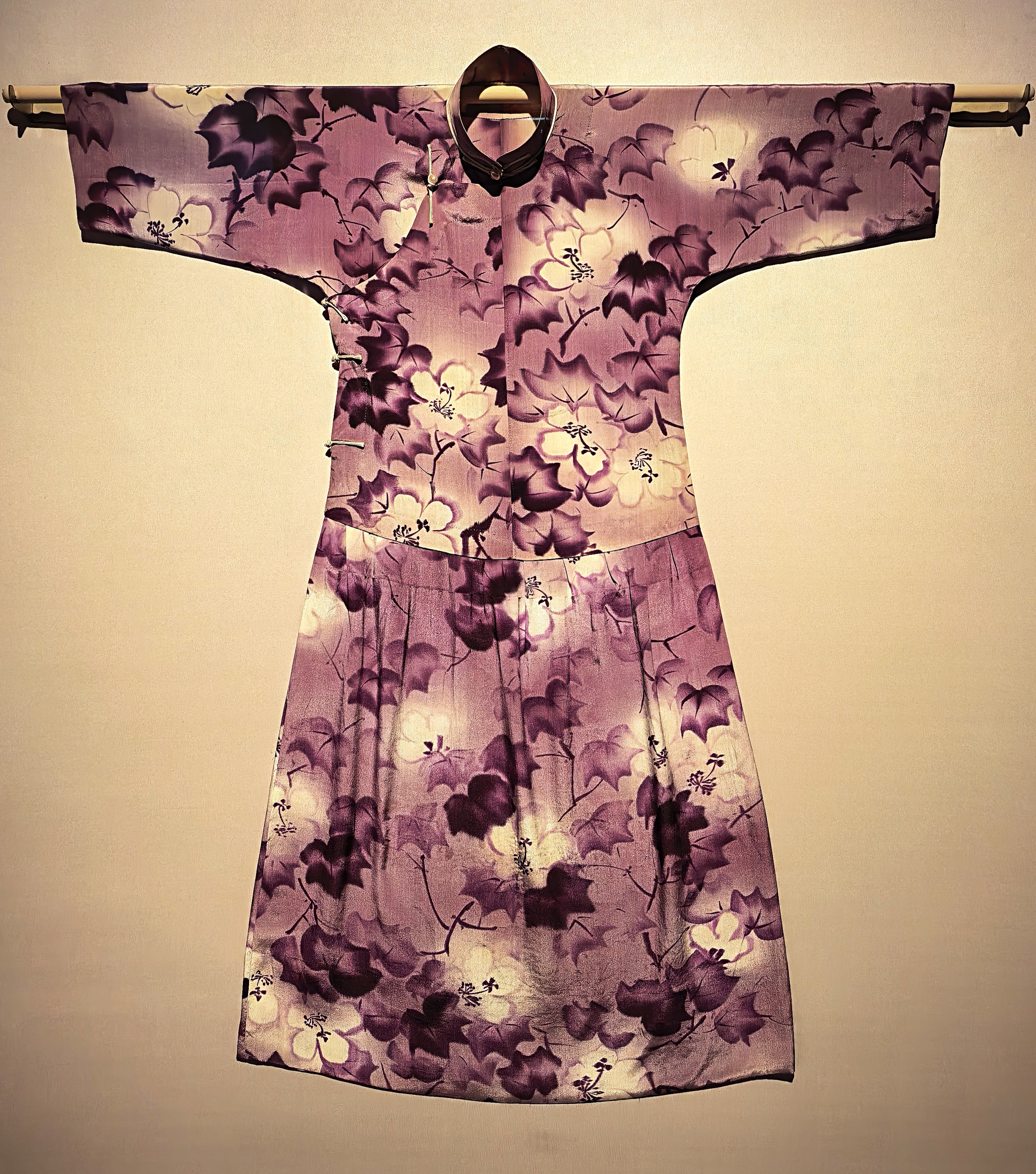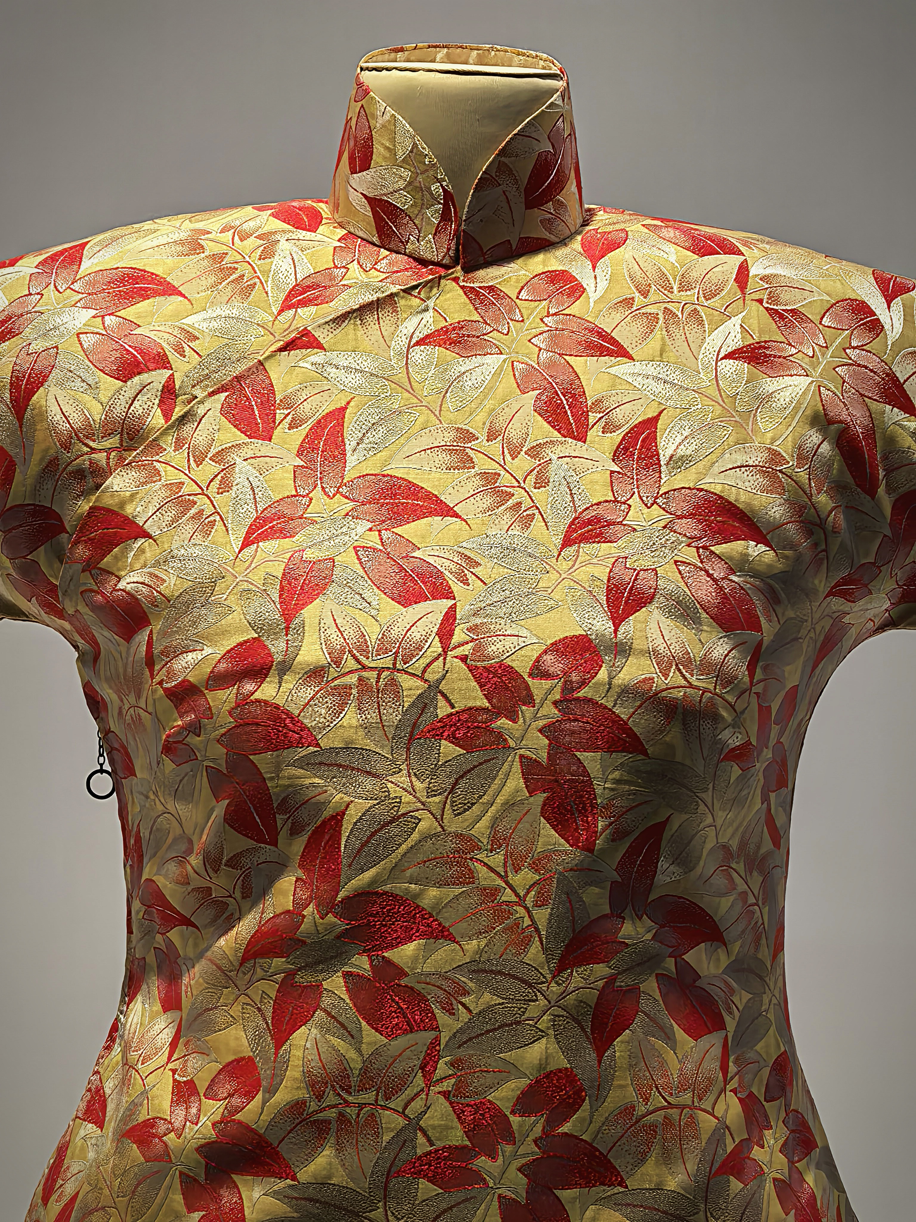 Kreppszatén qipao levélmintával az 1930-as évekből.