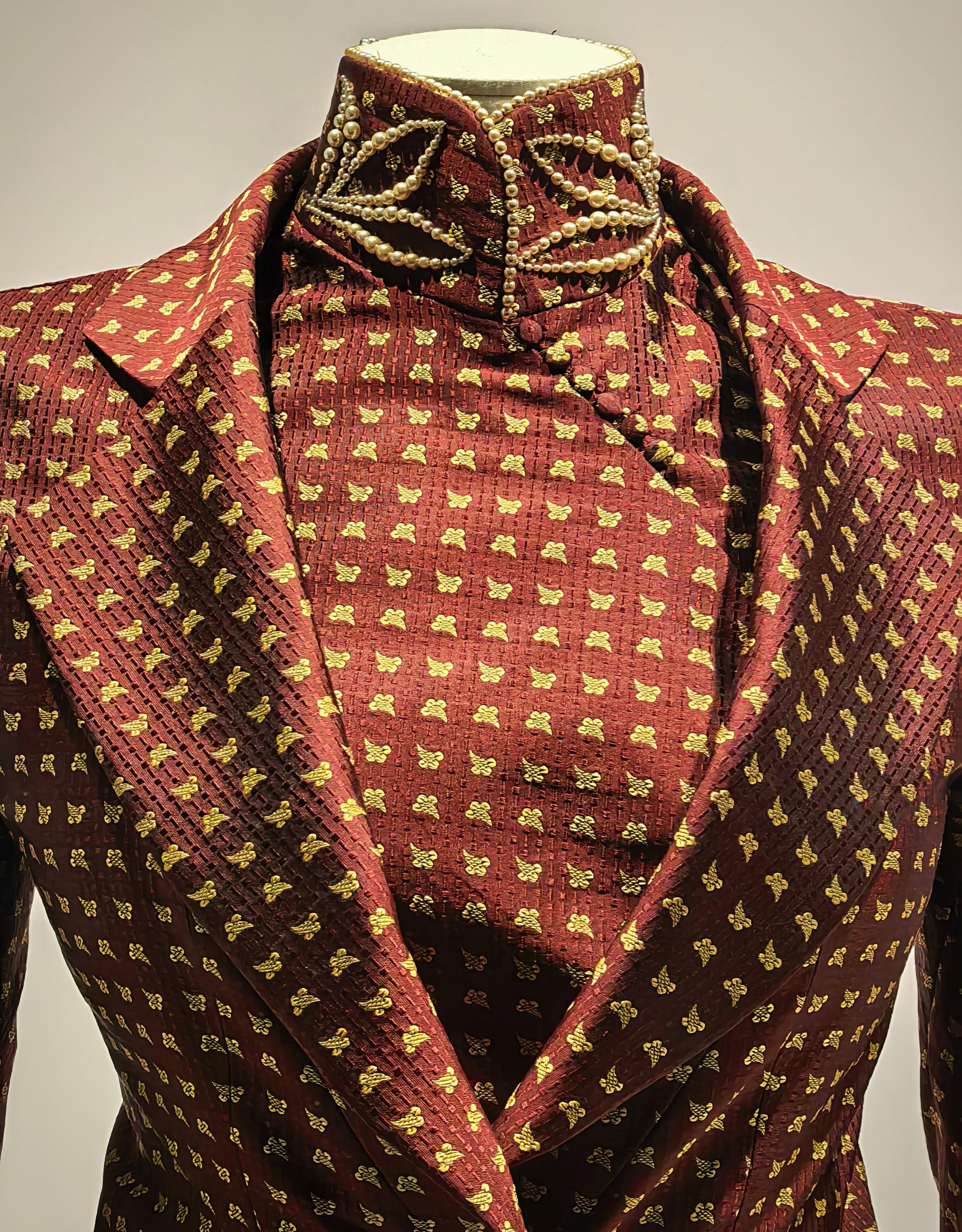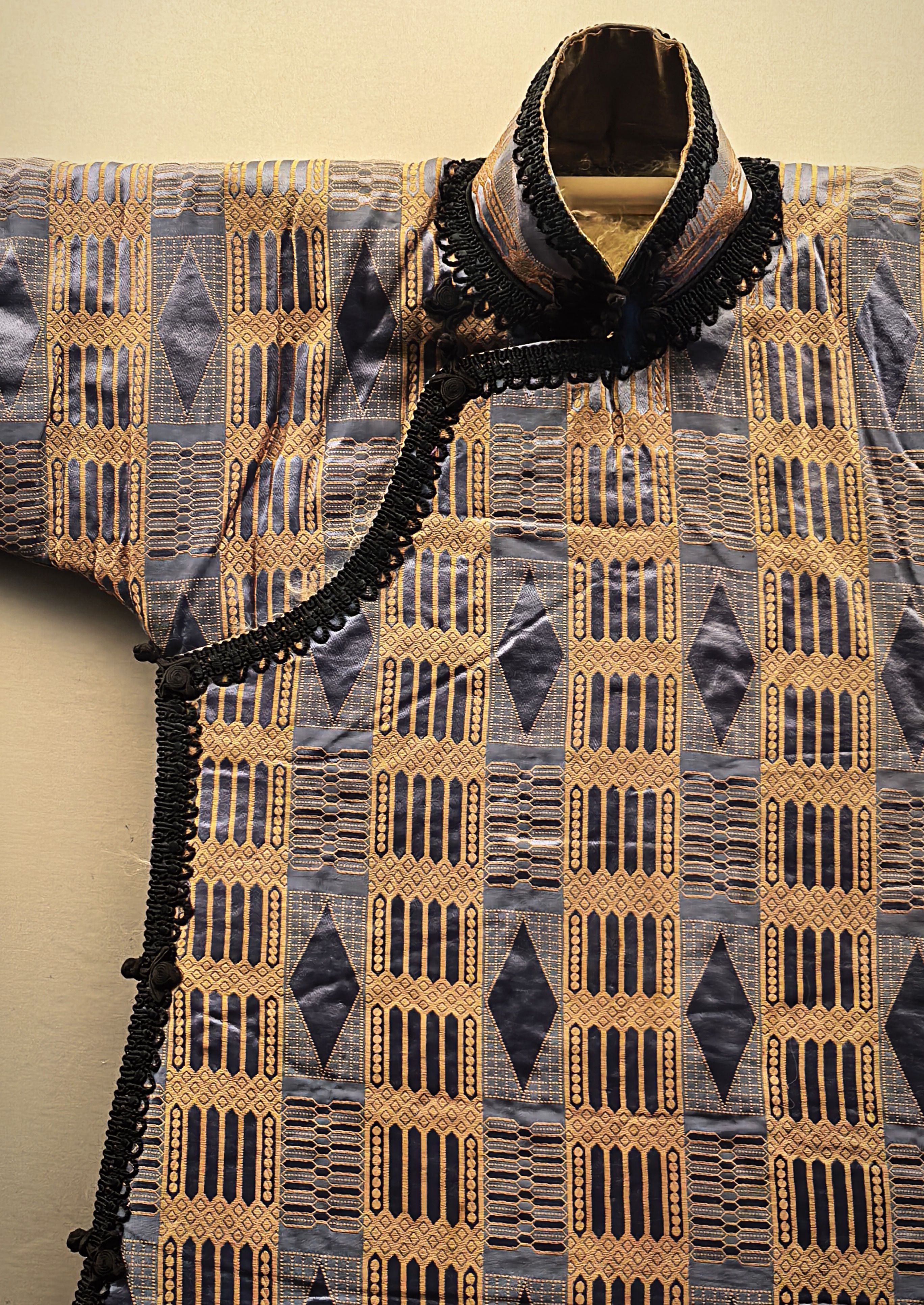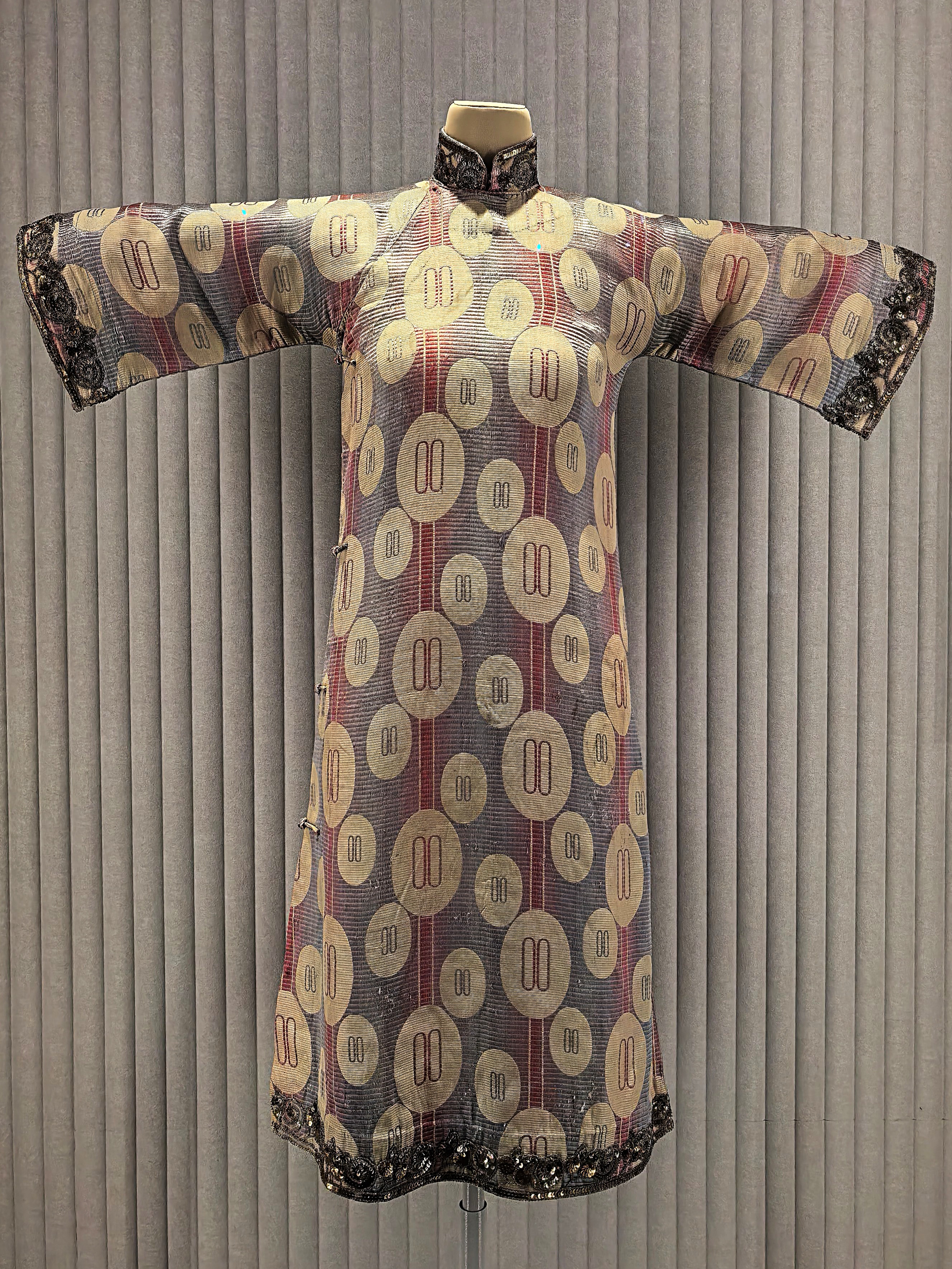 Jacquard szatén qipao geometrikus mintával az 1920-as évekből.