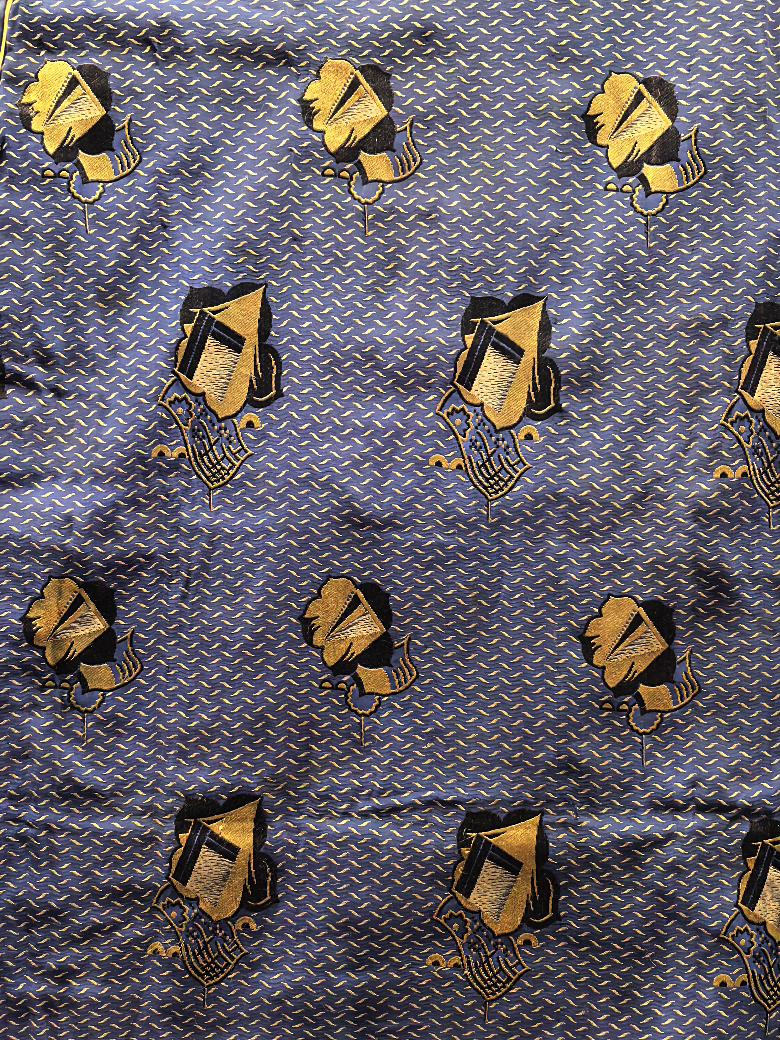 Kék jacquard selyem geometrikus mintával az 1920-as 30-as évekből.