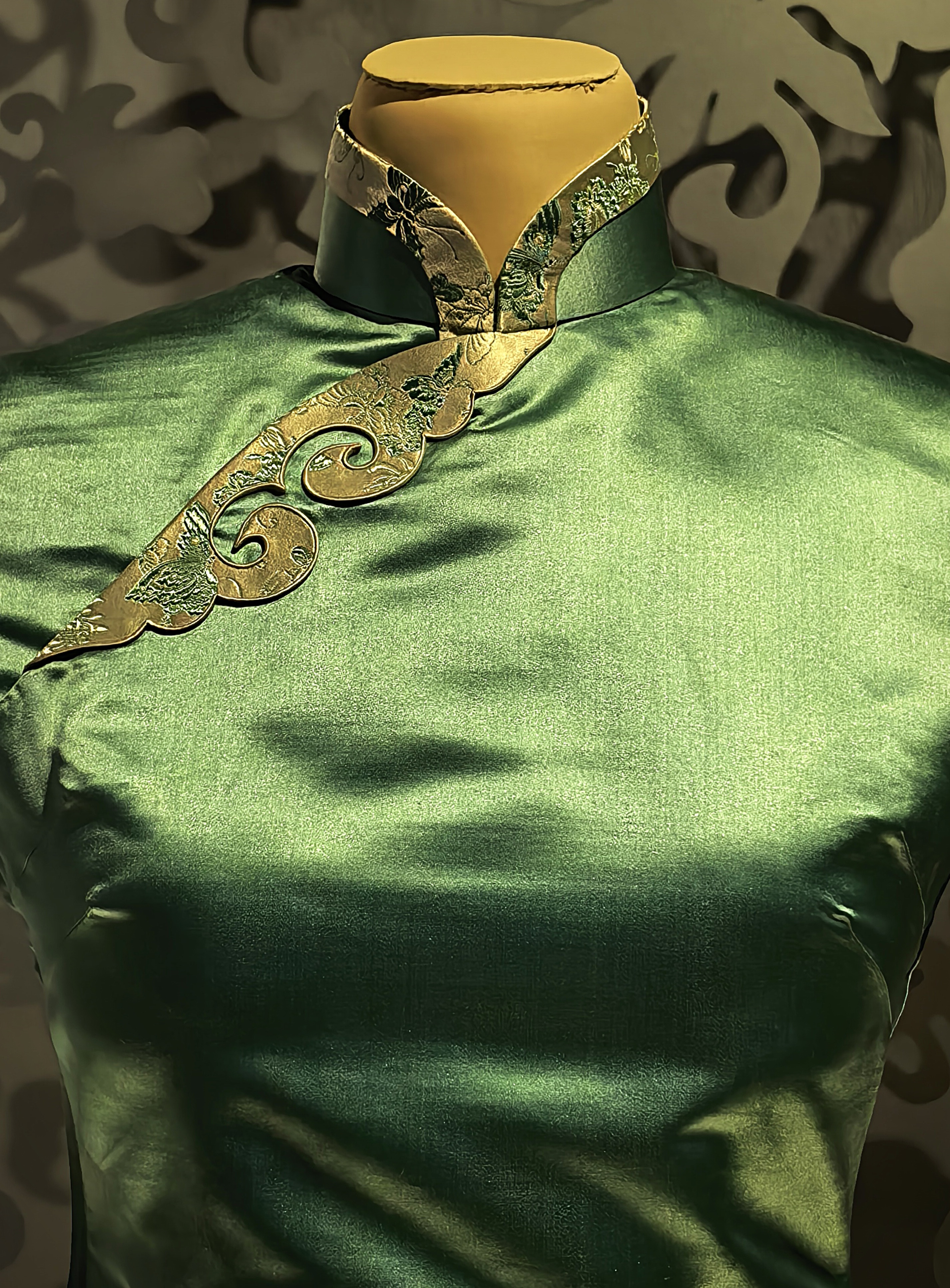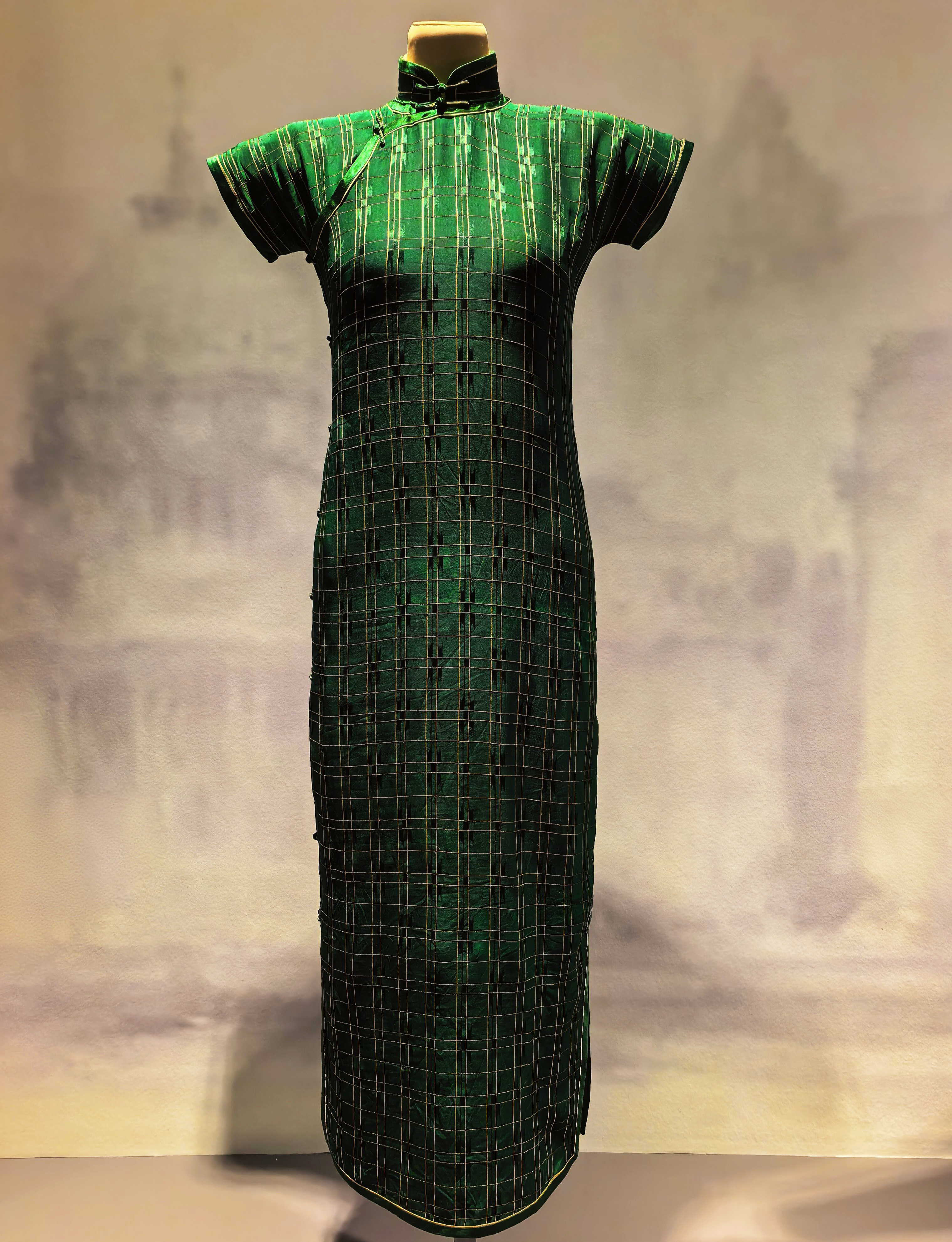 Sötétzöld jacquard selyem qipao rácsmintával, 1930-as 40-es évek.