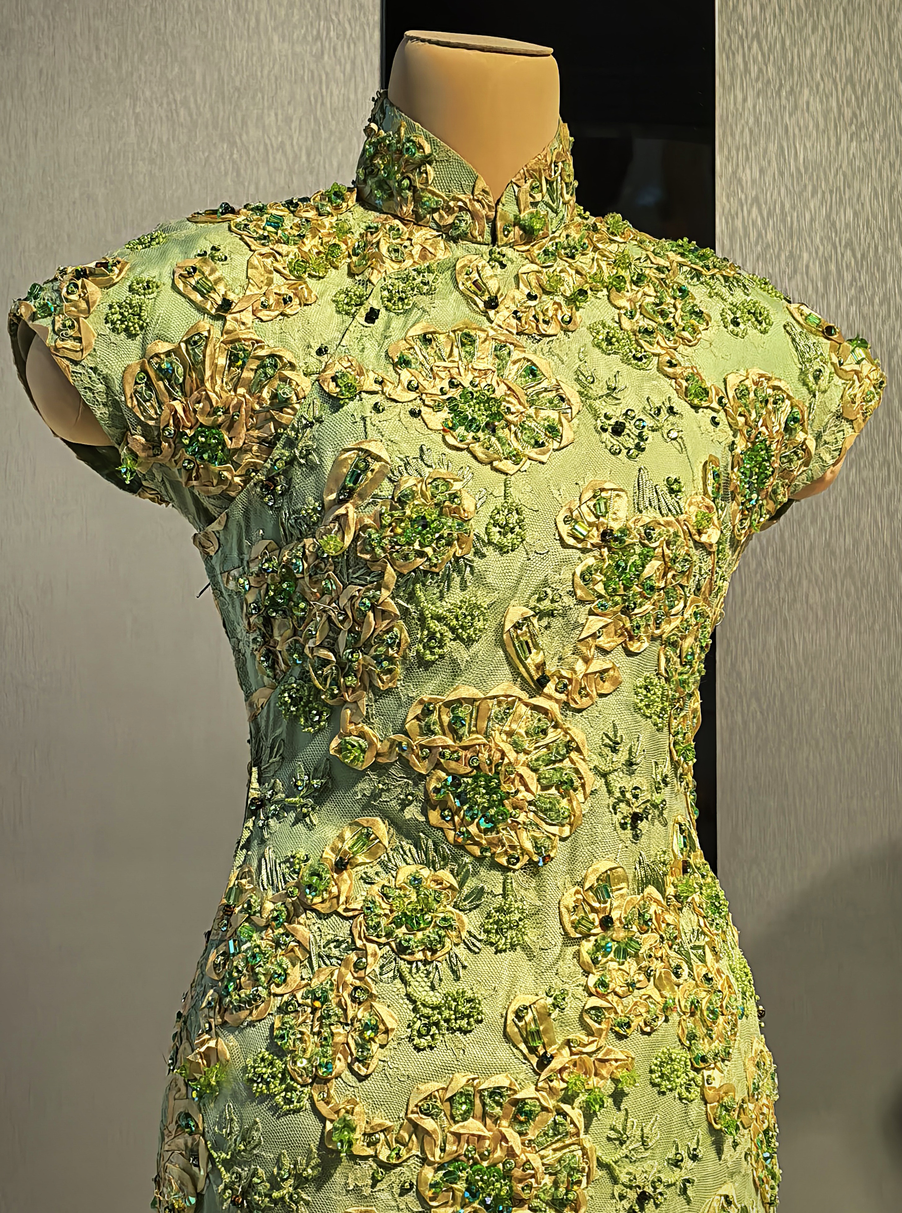 Halványzöld gyönggyel és szalaggal hímzett virágos qipao, 1940-es 50-es évek.