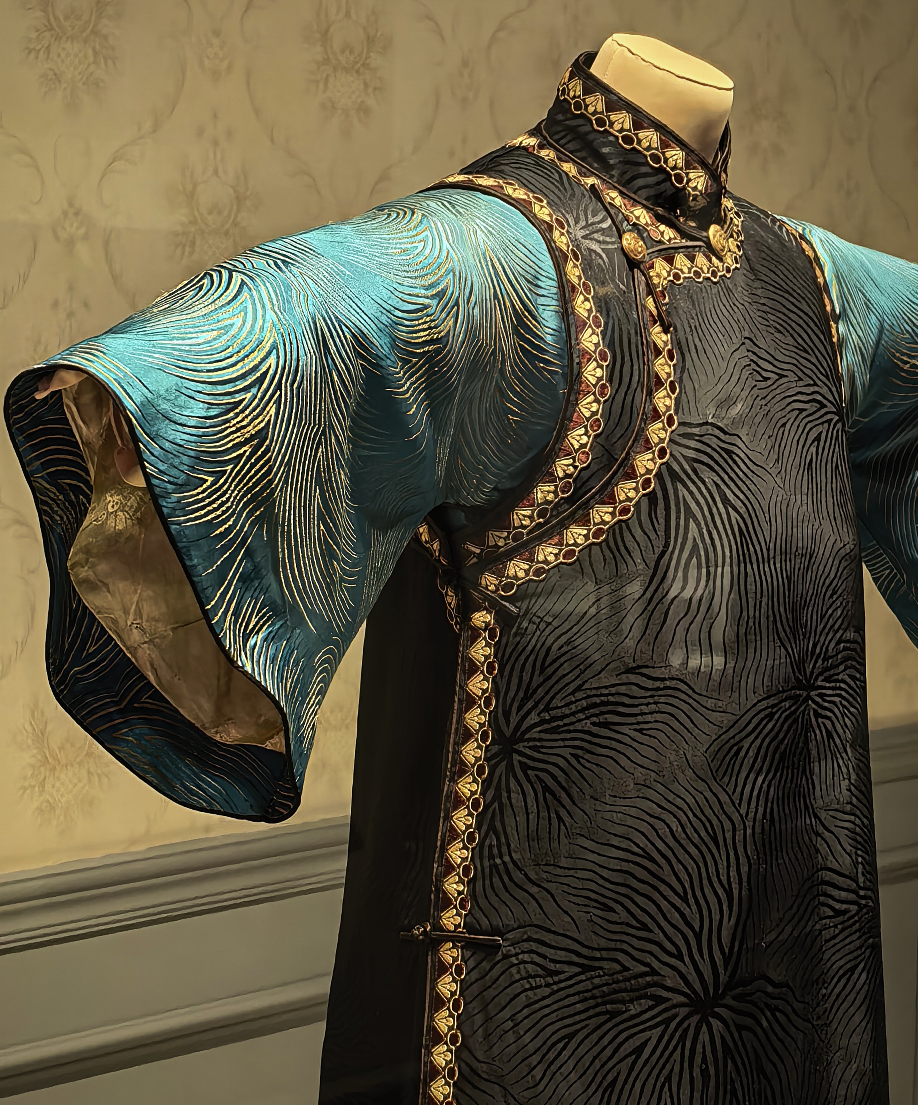 Sötétkék és arany köpeny csikóhal mintával az 1920-as évekből.