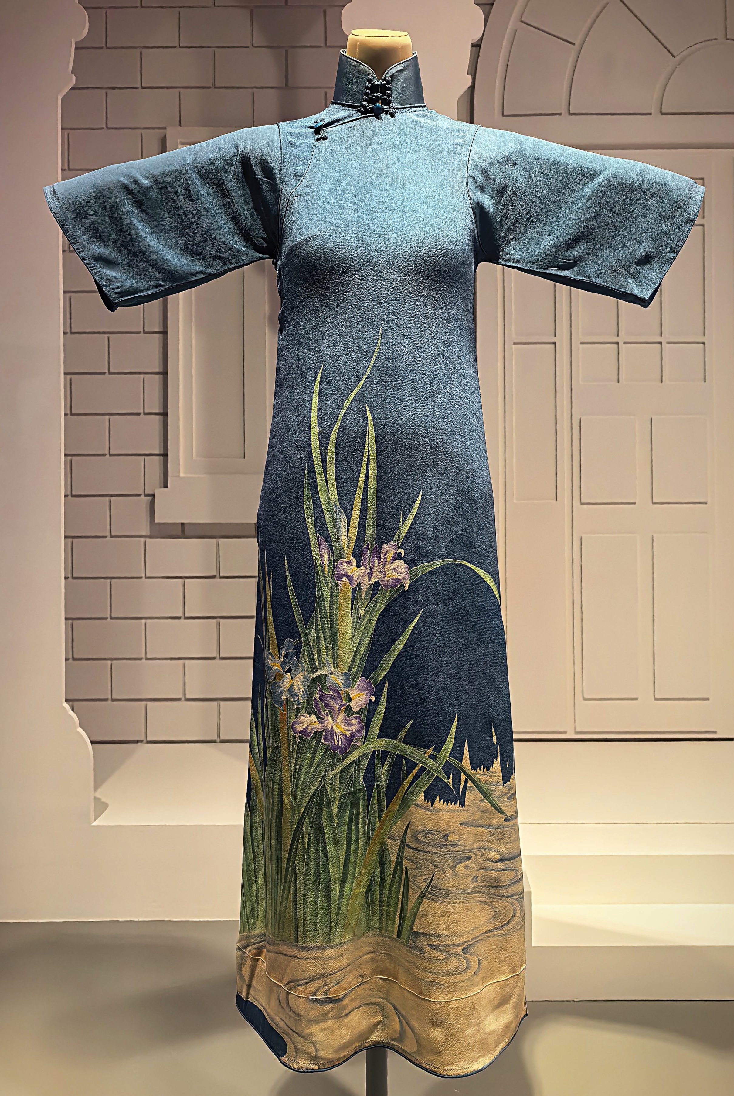 Kék kreppszövet qipao festett írisz mintával az 1920-as évekből.